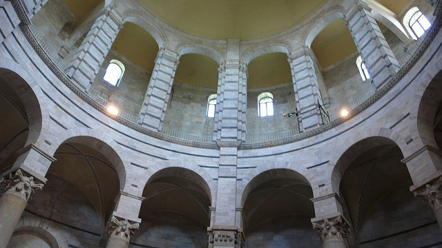 Este monumental edificio es dedicado a San Giovanni Battista y forma parte del estupendo complejo de Piazza dei Miracoli. Su cúpula, con forma de pirámide fue construida con ladrillos colorados y plomo blanco. Fue en el Baptisterio de Pisa que en el año 1564 fue bautizado Galileo Galilei.