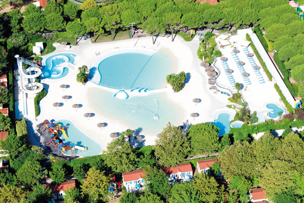 Un camping cuatro estrellas con diversas fórmulas de alojamiento. Espacios equipados para campers o casas rodantes, casas móviles, bungalows, camping-homes, alojamiento en hotel cuatro estrellas en el complejo turístico vacacional, según el gusto y la necesidad de los huéspedes. La estructura cuenta con dos supermercados y 25 negocios diversos. También, este complejo posee dos parques de agua para la diversión de grandes y chicos. La playa se encuentra a 1km de la estructura y posee un área de juegos para niños.