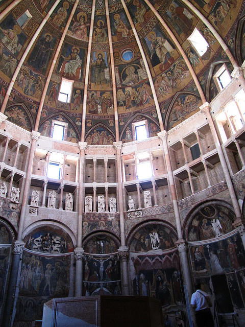 El Baptisterio de Parma es una espléndida construcción octogonal de mármol rosa, ubicado en el centro de la ciudad. Su edificación se inició en el año 1196 y el arquitecto fue Benedetto Antelami, el primer grande intérprete del gótico en Italia, escultor y arquitecto activo entre la segunda mitad del siglo XII y el primer treinteno del siglo XIII en el área Lombarda-Ligure y Emiliana. La belleza del Baptisterio, se exhibe en su parte exterior como interior. Los frescos que decoran sus paredes son sorprendentes: animales reales e imaginarios de todo tipo y el famoso ciclo de figuras que representan los meses y las estaciones del año, junto con los signos del zodíaco. En ocasión al IX centenario de la catedral, el Baptisterio fue objeto de restauración. En este contexto, las instituciones públicas locales, han solicitado la introducción del mismo a la lista de los sitios declarados por la UNESCO patrimonio de la humanidad. Merece una visita, realmente es fantástico.